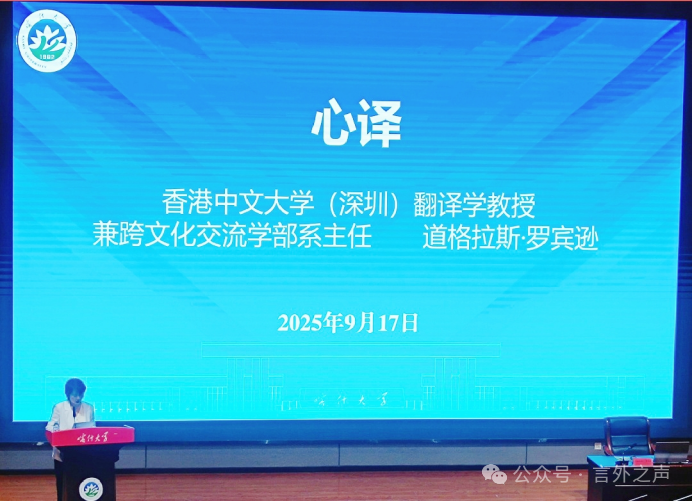 9月17日,我院邀请香港中文大学(深圳)翻译学教授兼跨文化交流学部系主任道格拉斯·罗宾逊开展了以《心译》为主题的学术讲座。本次讲座由学院党委委员、副院长舒进艳主持,学院部分教师、MTI研究生和23级、24级翻译专业本科生参加。